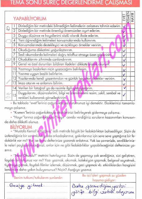 Öğrenci çalışma kitaplarının kullanımında ölçme ve değerlendirme çalışmalarına yeterli önemi vermelisiniz. ÖÇK’de yer verilen etkinliklerin temalara dağılımı sayısal bakımdan genel olarak dengelidir. 5. Sınıf Türkçe Cem Veb Ofset Çalışma Kitabı Cevapları’nda gerek etkinlik içi gerekse tema sonu ölçme-değerlendirme çalışmaları kapsamında öz değerlendirme, akran değerlendirme vb. etkinlikler gerçekleştirilmemiştir. Bunlar Türkçe ÖÇK’nin kullanımının işlevselliğini etkileyen unsurlar arasında sayılabilir. Sonuç olarak ilköğretim ikinci kademe Türkçe öğretiminde kullanılan öğrenci çalışma kitaplarının, hedeflenen işlevi tam olarak yerine getirmediği söylenebilir.